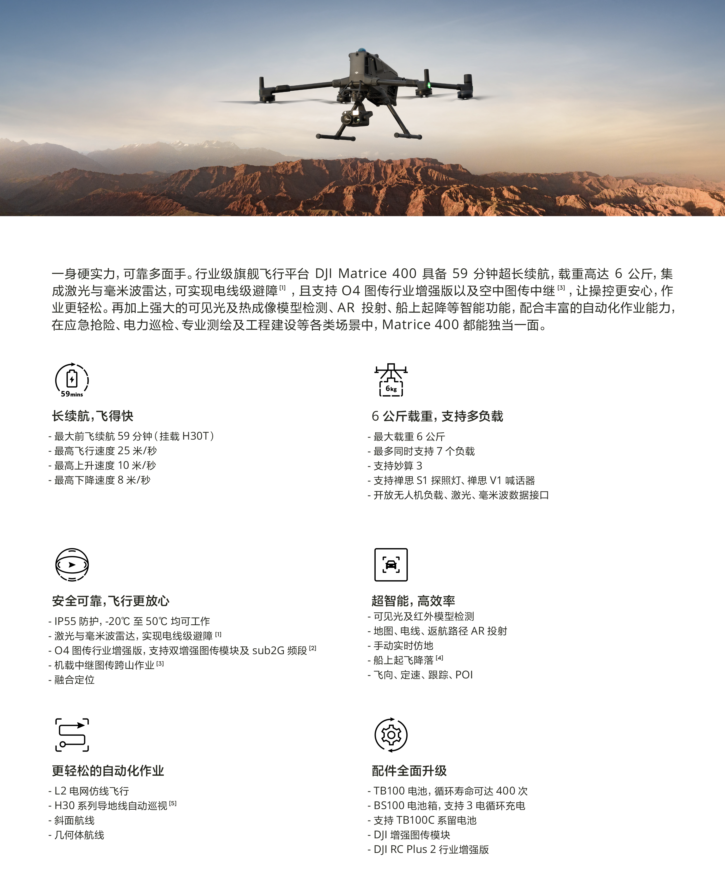 一身硬实力,可靠多面手。行业级旗舰飞行平台 DJI Matrice 400 具备 59 分钟超长续航,载重高达 6 公斤,集成激光与毫米波雷达,可实现电线级避障,且支持 O4 图传行业增强版以及空中图传中继,让操控更安心,作业更轻松。再加上强大的可见光及热成像模型检测、AR 投射、船上起降等智能功能,配合丰富的自动化作业能力,在应急抢险、电力巡检、专业测绘及工程建设等各类场景中,Matrice 400 都能独当一面。