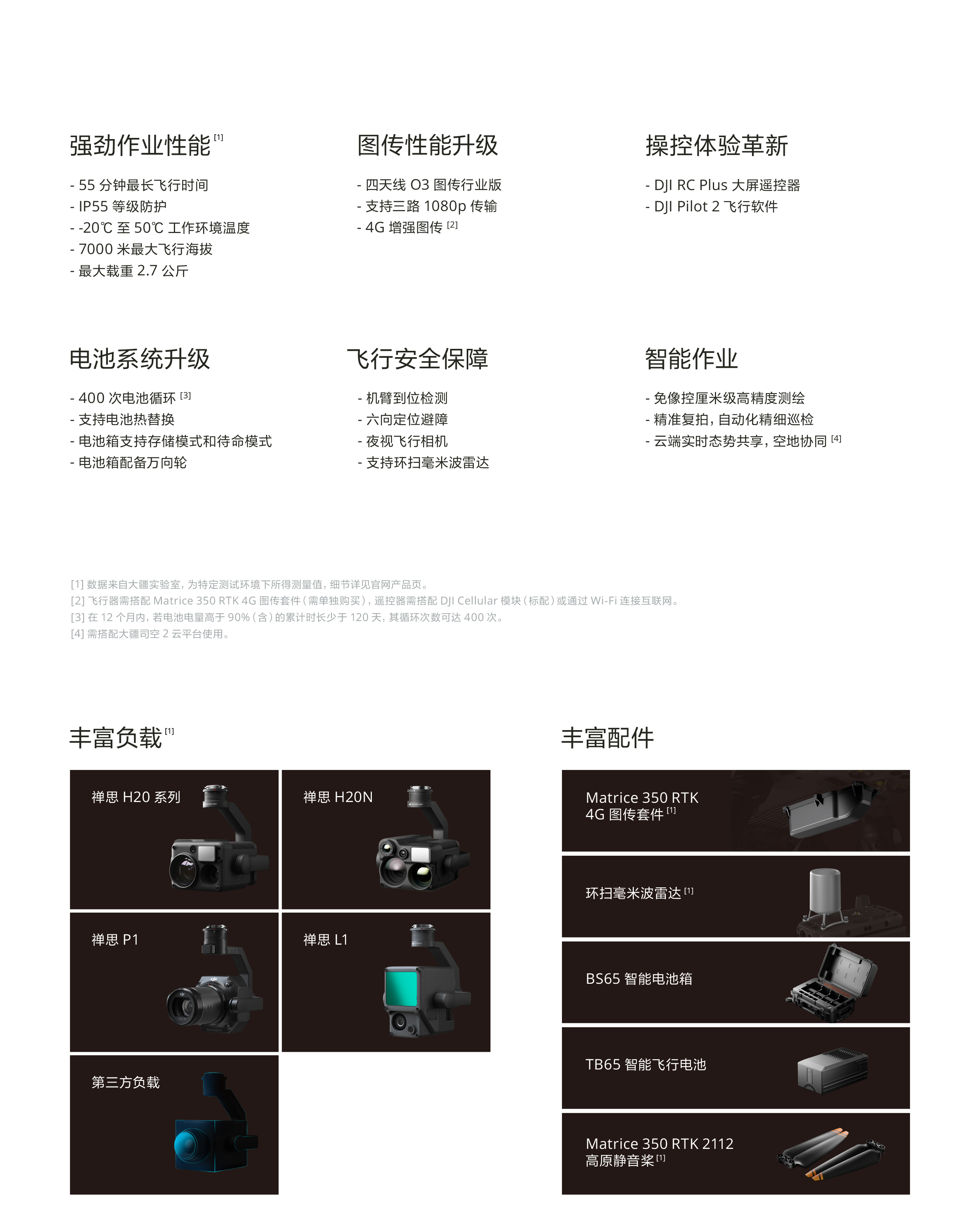 旗舰新升级,行业新高度。全新图传系统和操控体验,更高效的电池系统,更全面的安全保障,以及强大的负载和拓展能力,让新一代飞行平台 Matrice 350 RTK 满载实力,为空中作业注入革新力量。