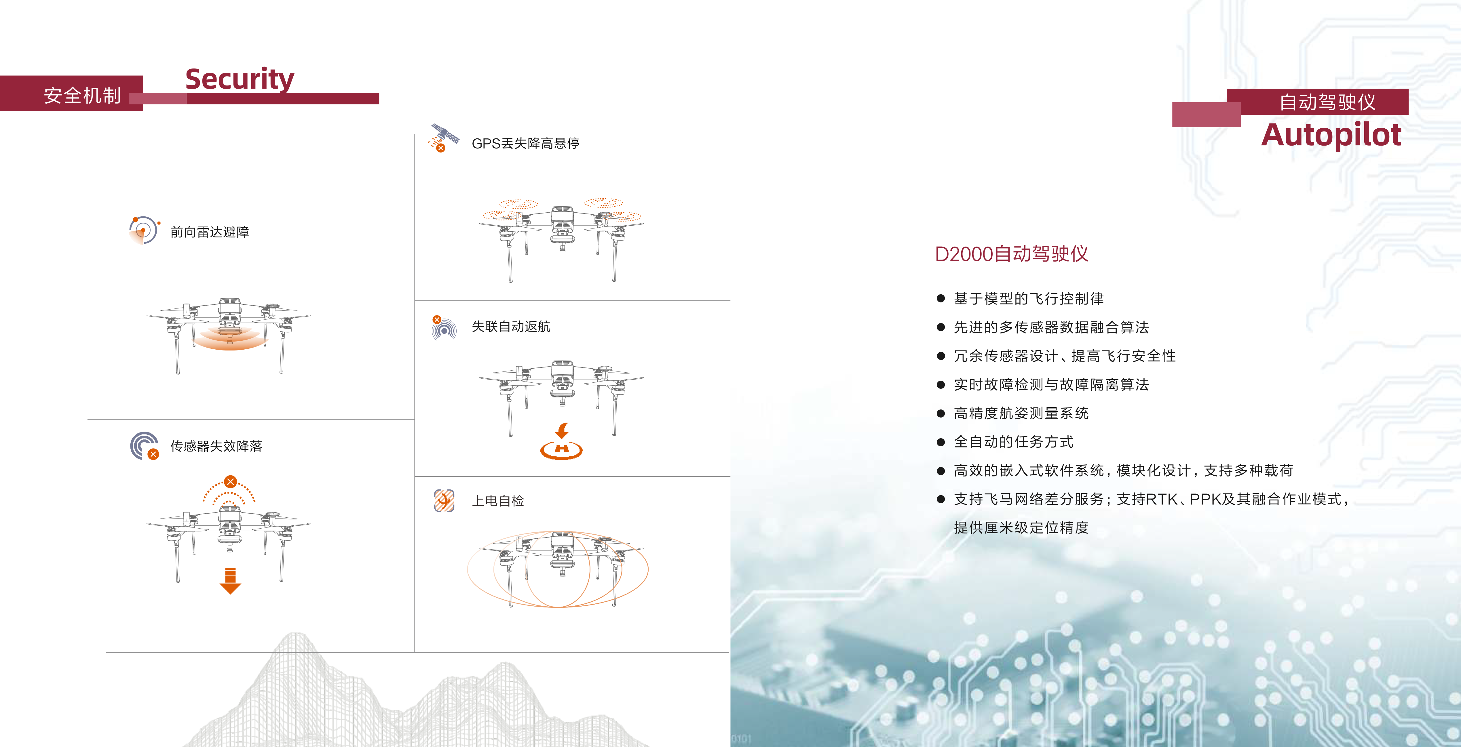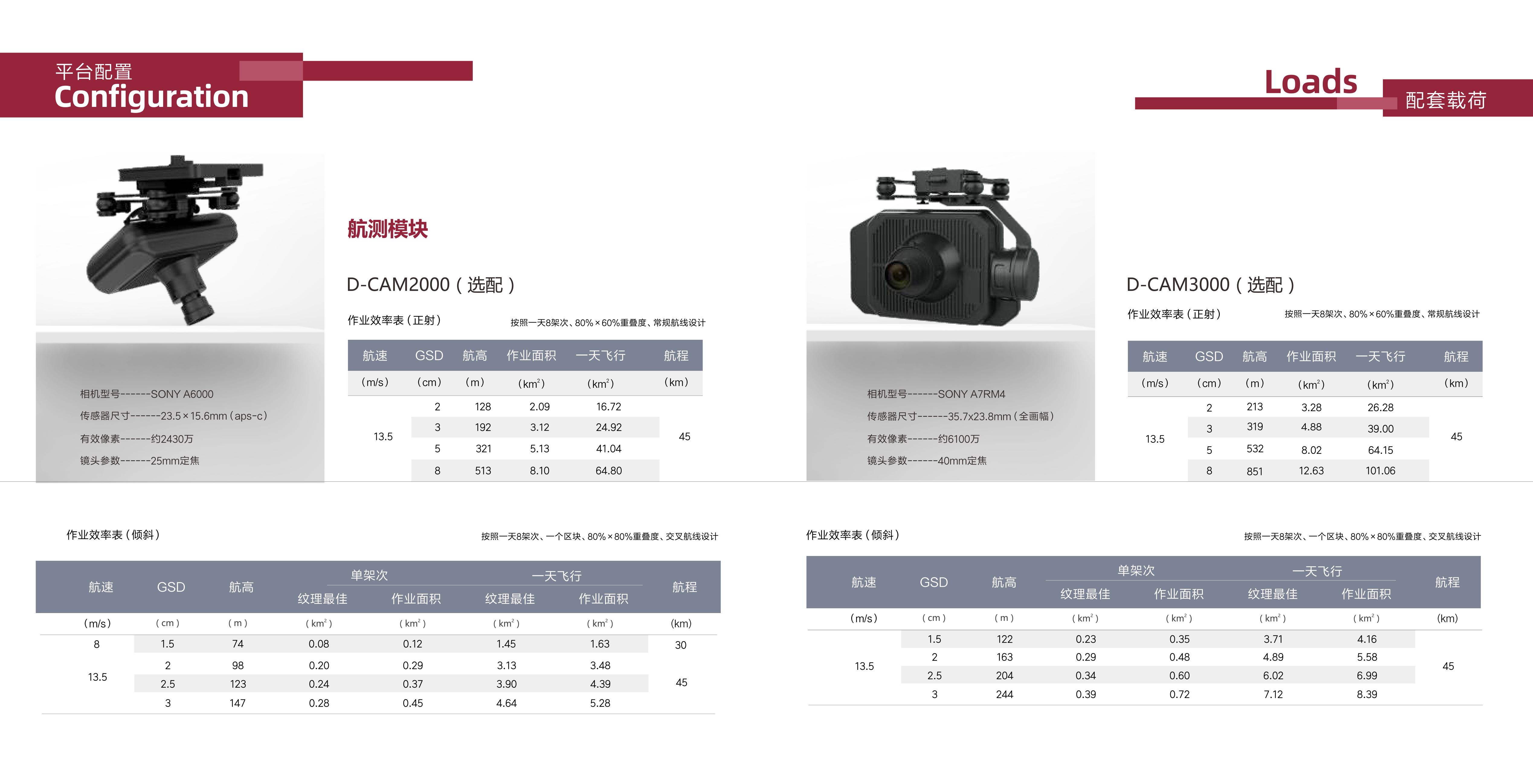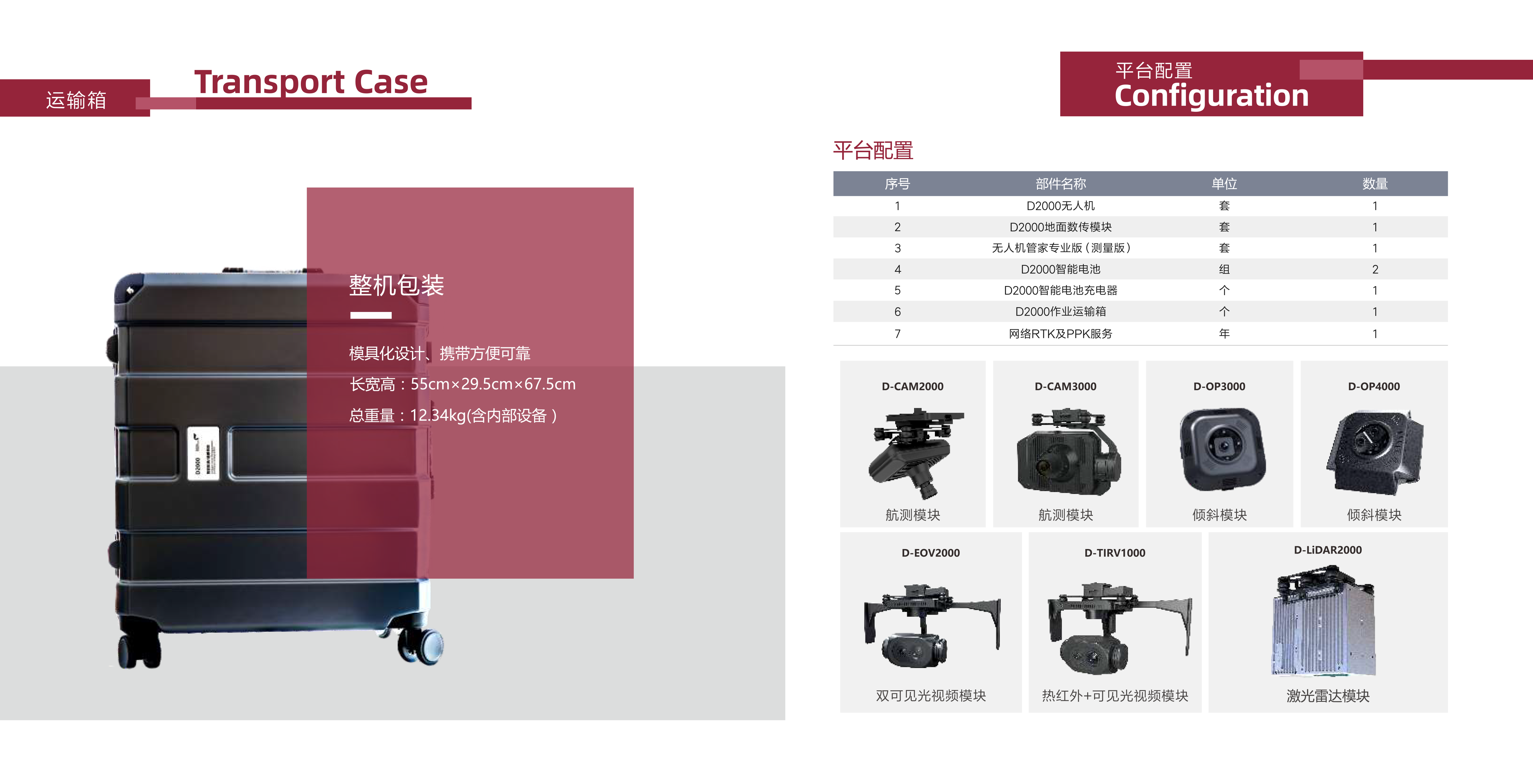 D2000的任务载荷采用模块化设计,搭配航测模块、倾斜模块、热红外遥感模块,可满足航测、真三维模型、遥感监测应用;此外还可换装可见光视频模块、热红外视频模块等视频应用载荷,搭载远距高清图传,可实现目标识别、目标定位、目标实时追踪和目标位置、速度估算等功能。